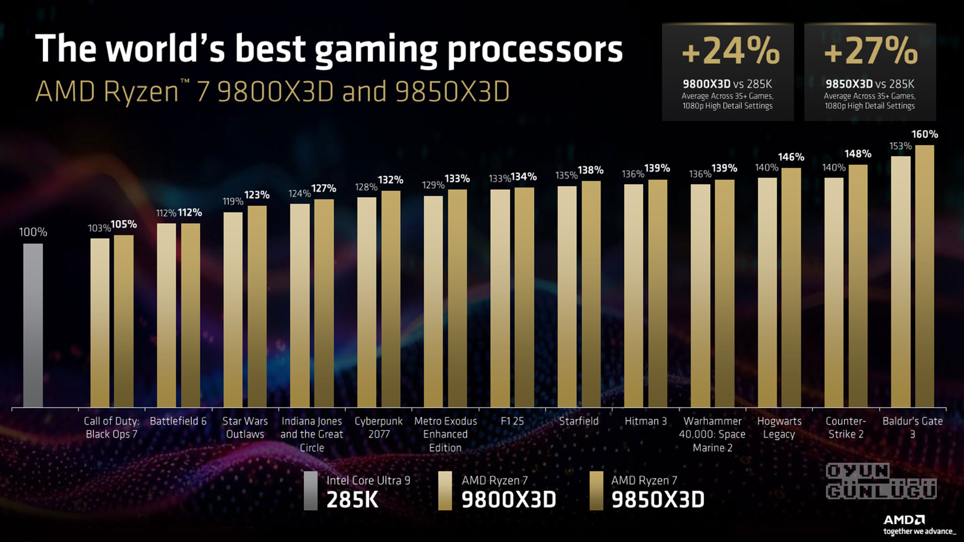 Serinin yıldızı Ryzen 7 9850X3D, 8 çekirdek ve 5.6 GHz hızına sahip. 104 MB önbellek ile gelen işlemci, testlerde rakibi Intel Core Ultra 9 285K'dan ortalama %27 daha yüksek oyun performansı sunuyor.