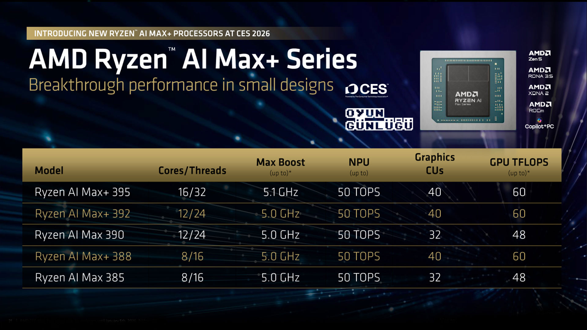 Ryzen AI Max+ Serisi, 2026’nın ilk çeyreğinde piyasaya çıkacak ve özellikle kompakt masaüstü sistemler ile premium laptoplarda konumlandırılacak. CES 2026'daki tüm AMD duyuruları için buraya göz atabilirsiniz.