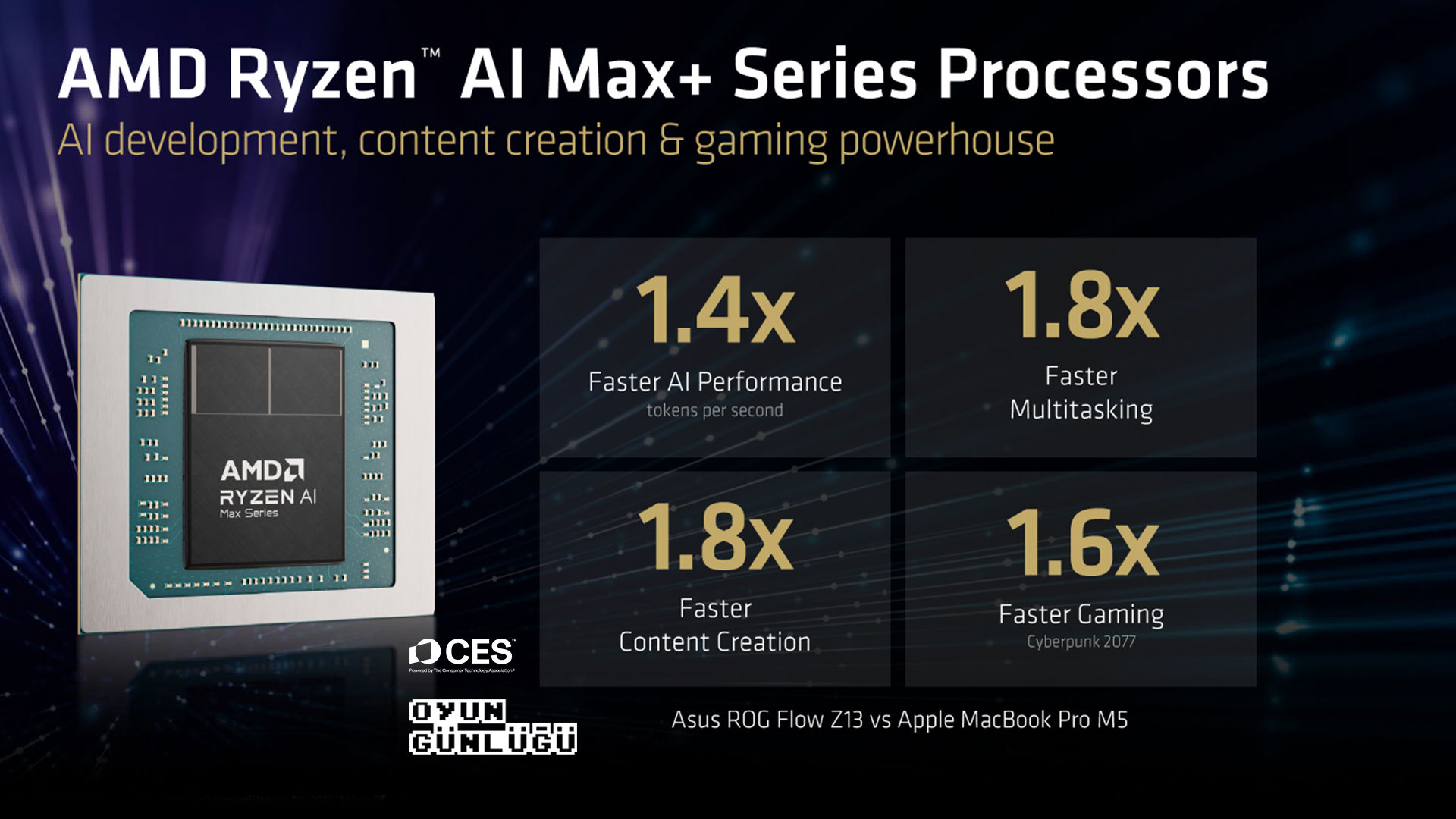 AMD, Ryzen AI Max+ işlemcilerini Apple’ın M5 tabanlı sistemleriyle karşılaştırdı. Sunuma göre x86 tarafında Mac seviyesinde performans hedefleniyor.