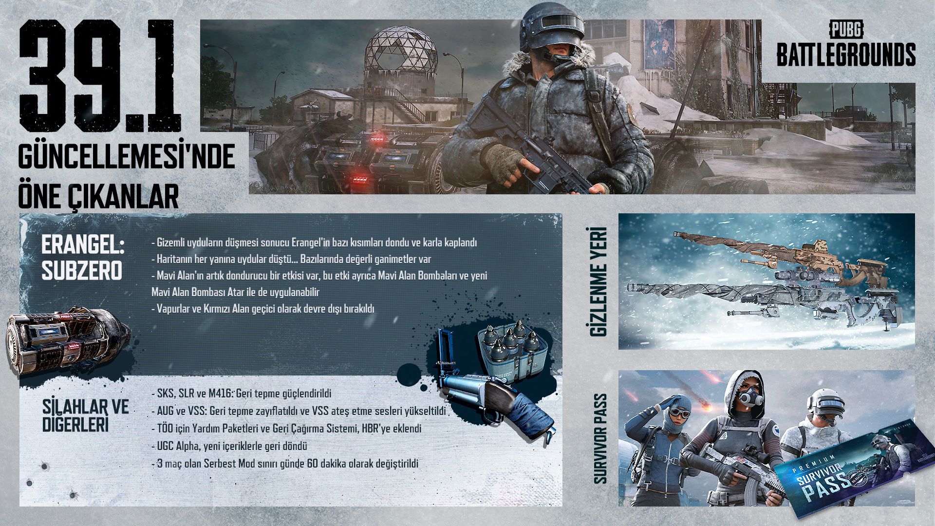 Erangel’ın dönüşümünün temelinde, Tythonic tarafından yapılan ancak ters giden bir uydu deneyi yer alıyor. Atmosfere yayılan dondurucu soğuk adaya yoğun kar yağışı getirirken, Mavi Alan da artık donma etkisi yaratıyor. Oyuncular, düşen uydular, yeniden tasarlanan uçak modelleri ve havada hissedilen soğuk efektiyle karşılaşıyor. Yeni eklenen Mavi Alan Bombası ve Bombası Fırlatıcısı ise donma etkisini tetikleme imkânı sunuyor. Subzero hikâyesi 39.2 güncellemesiyle devam edecek.