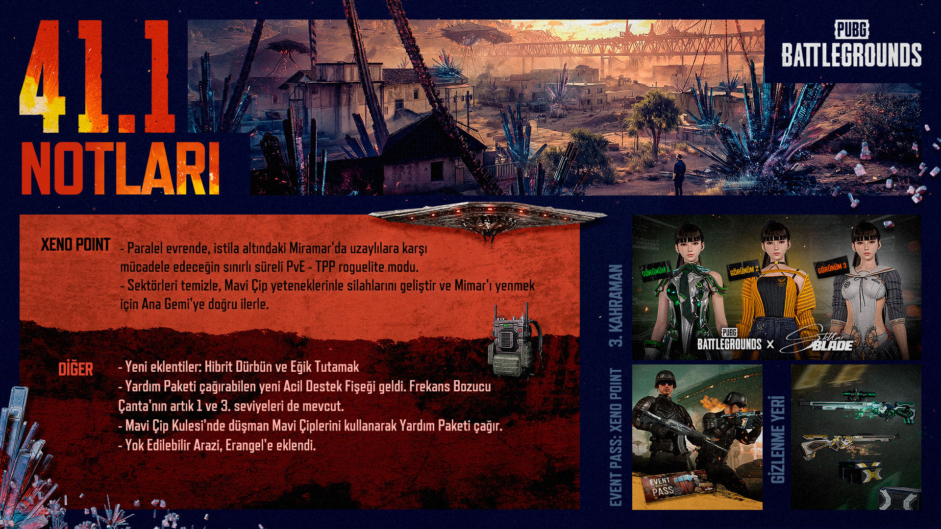 PUBG: Battlegrounds, 41.1 güncellemesiyle oyuna oldukça farklı bir soluk getiriyor. Güncellemenin en dikkat çekici yeniliği, Miramar'ı uzaylı istilasına sahne yapan iş birlikçi roguelite PvE modu Xeno Point. Bunun yanında Stellar Blade'in baş karakteri EVE oyuna dahil olurken, aespa temalı kozmetikler de sınırlı süreliğine geri dönüyor.
