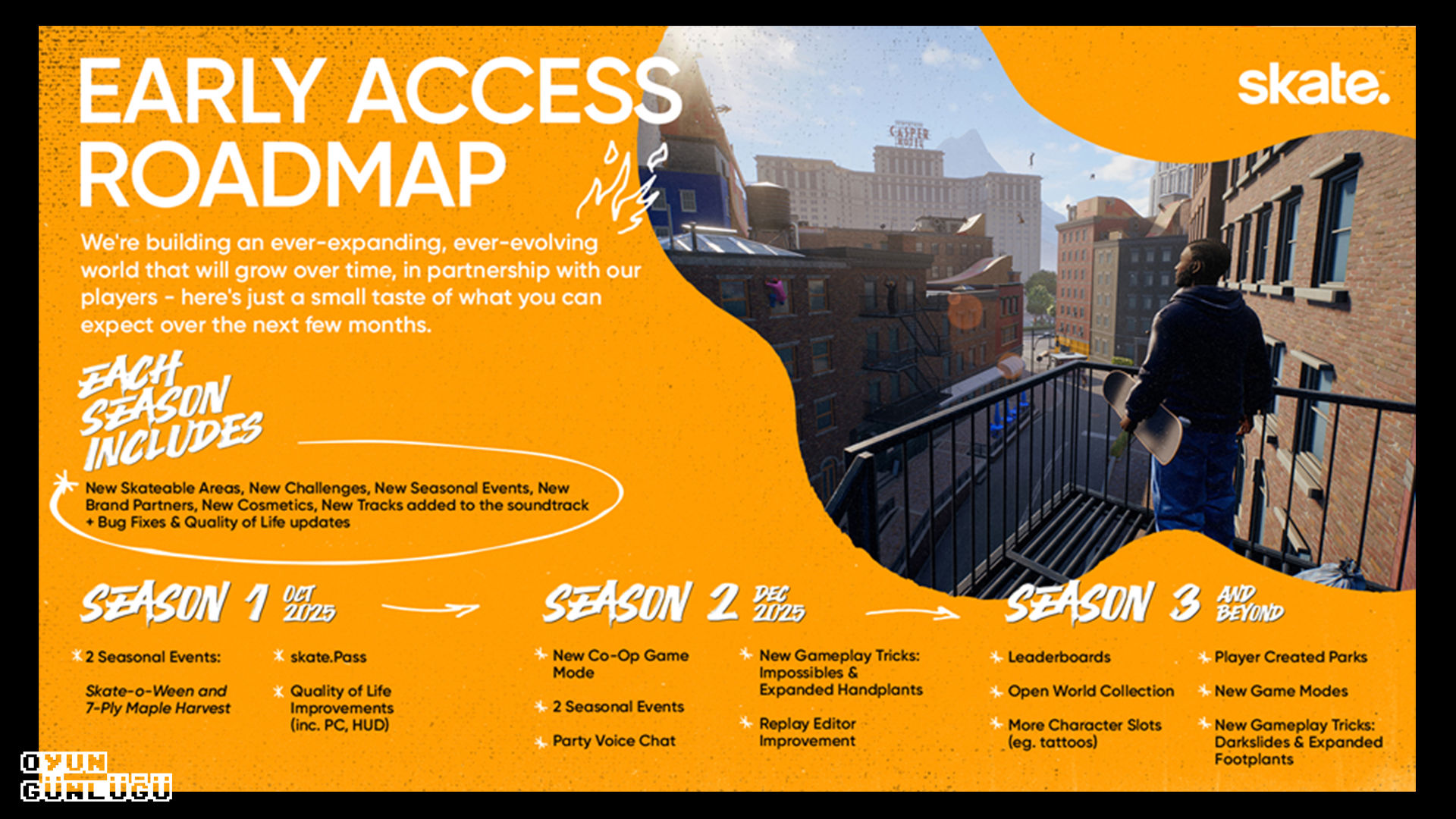 Full Circle tarafından geliştirilen ve Electronic Arts tarafından da yayımlanacak kaykay oyunu için erken erişim yol haritası açıklandı. Oyunun önümüzdeki aylarda alacağı güncellemeler sezonlara ayrılmış şekilde sunuldu.