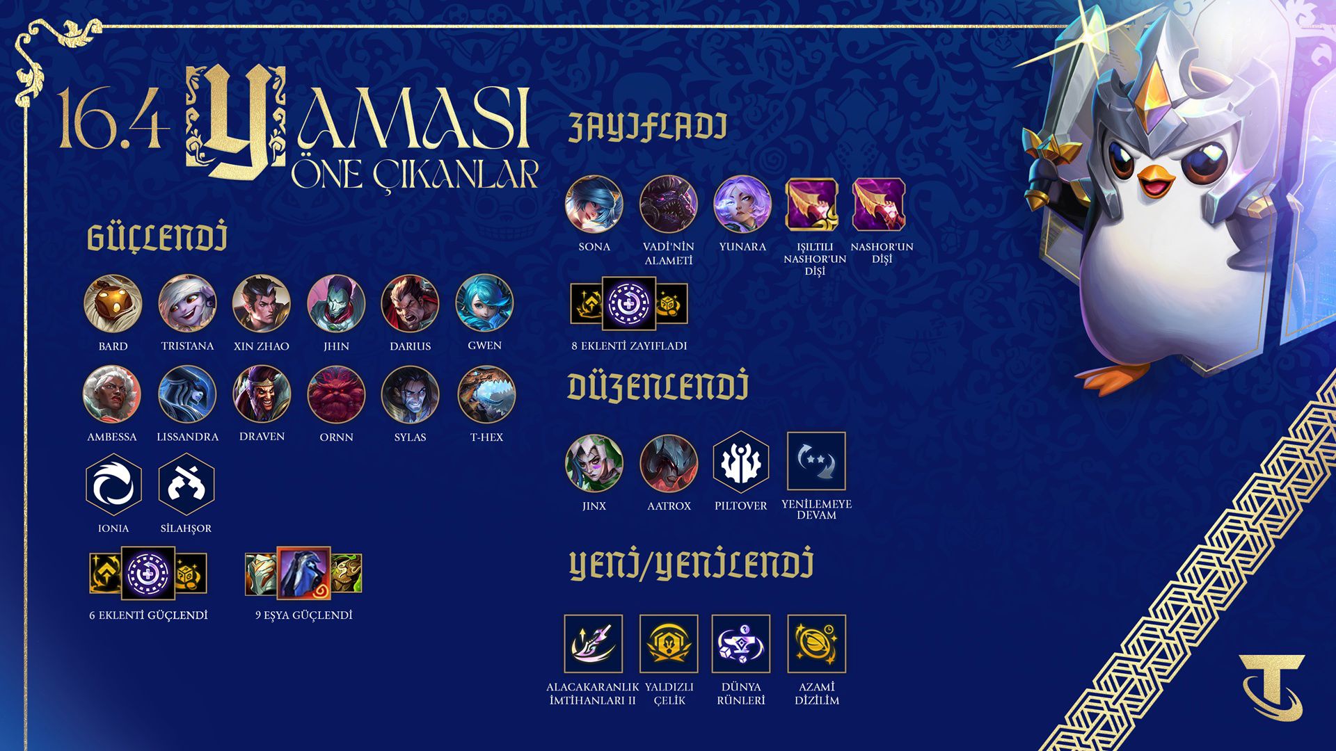 Yone için gereken koşullar da değişti. Daha önce üç yıldızlı Yasuo istenirken artık 7. seviyede üç eşyalı iki yıldızlı Yasuo yeterli olacak. Veigar tarafında ise kilit açma şartı sadeleştirildi ve bir Yordle şampiyonuna takılmış tek bir Rabadon’un Şapkası yeterli hale getirildi. Vadi’nin Alameti için gerekli Hiçlik savaş sayısı da sekizden ikiye düşürüldü ve buna 7. seviye şartı eklendi.