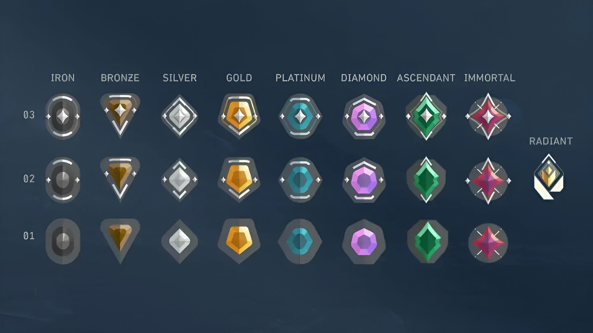 Rütbe yapısı 9 ana ligden ve toplam 25 kademeden oluşur. Sıralama Iron (Demir) ile başlar ve Radiant (Radyant) seviyesine kadar uzanır. Tüm ligler üç alt seviyeye ayrılır ancak Radiant tek kademeden oluşur.