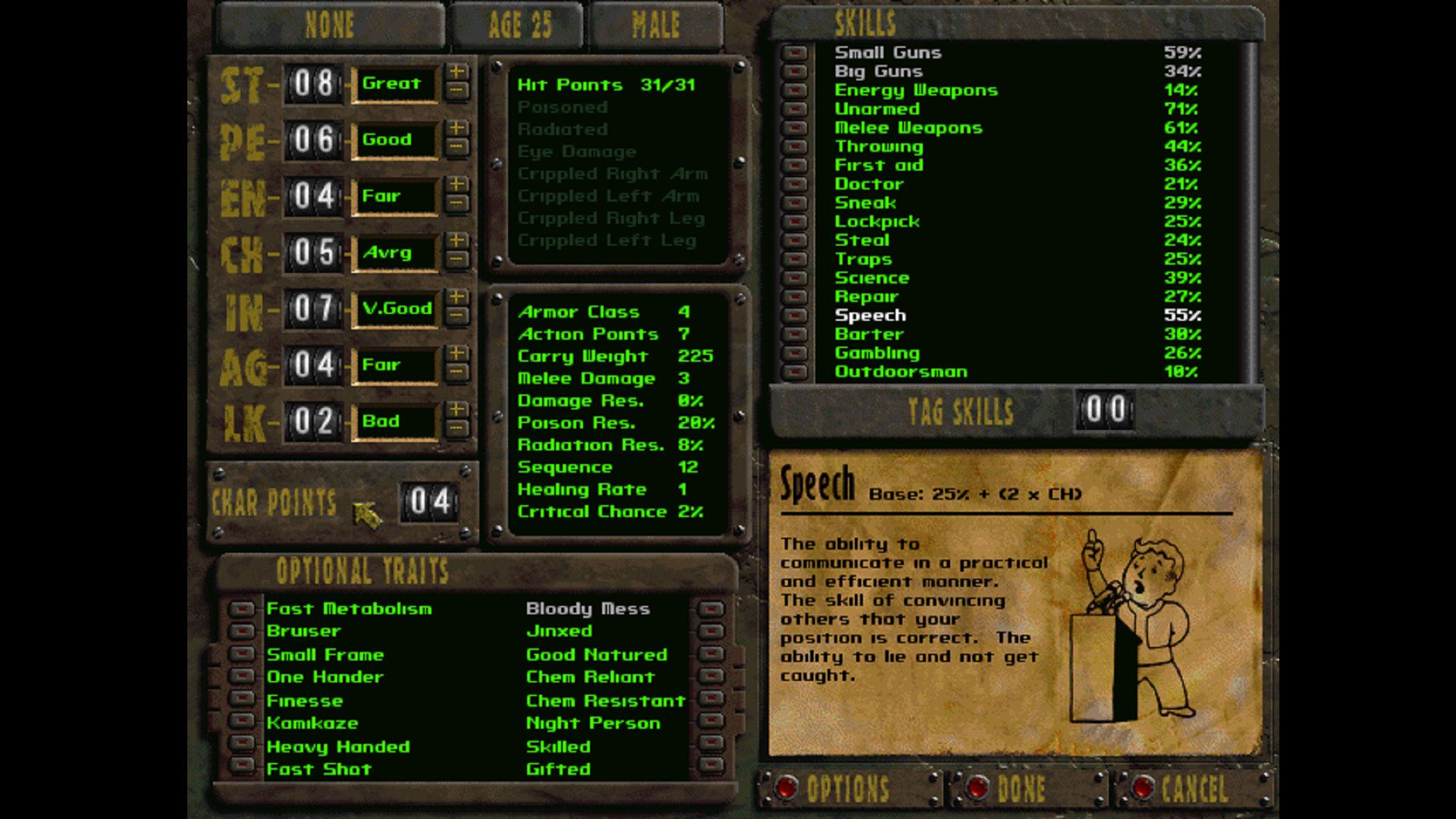 Her RPG gibi Fallout da oynanış boyunca diyaloğa girebileceğimiz pek çok NPC çıkarıyor karşımıza. Ve bu karakterlerden bazıları oyunda şahit olduğumuz hikayelere ve mücadelelere ciddi şekilde yön veriyor. Her birinin kendisine ait kişiliği ve amacı var. Dikkat edin: Yanlış bir diyalog seçeneğini tercih etmeniz durumunda karakterlerle aranız bir anda bozulabilir! Oyun, günümüz oyunlarına göre bu konuda çok daha cezalandırıcı davranıyor ve oyuncuyu ne söyleyip söylemeyecekleri konusunda ince eleyip sık dokumaya mecbur ediyor. Açıkçası Fallout'u benim için modern oyunlardan daha cazip kılan yönlerinden biri de bu."Talking Head" özelliği ise önemli karakterleri izometrik dünyadaki minik birer ikon olmaktan çıkarıyor. Bu karakterlerle diyaloğa girdiğimizde suratlarını sanki yüz yüzeymişiz gibi canlı canlı görüyoruz. Fiziksel dünyada kilden yapılan modeller dijital ortama aktarılıp, animasyonlarla zenginleştirilerek NPC'lerin yaşayan yüzleri haline geliyorlar. Bu gerçekçi etki hem dönemi için bile düşük kalite sayılabilecek grafiklere bir nebze canlılık katıyor, hem de karakterleri bizler için daha insan (veya mutant 😀) kılıyor.
