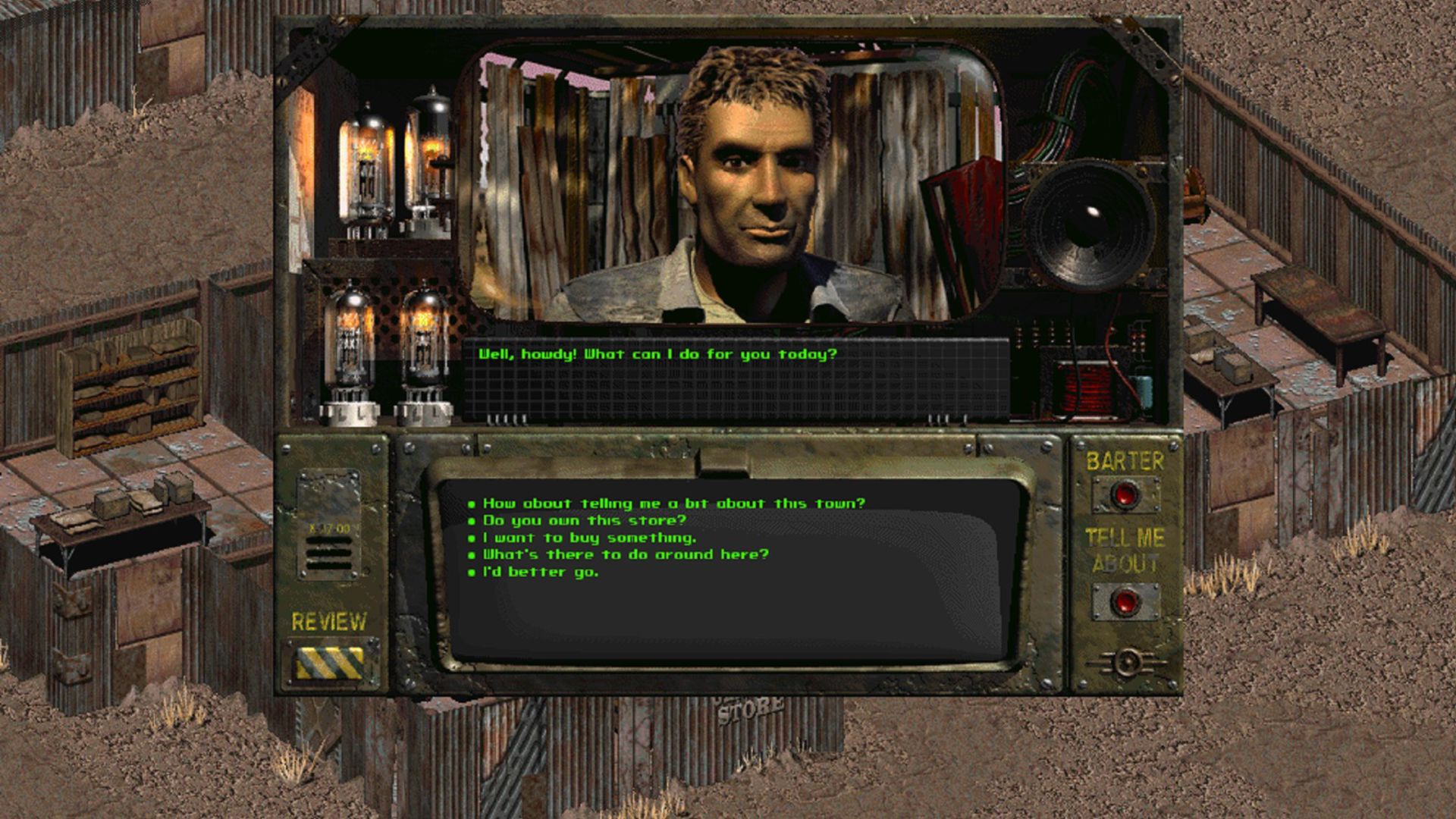 Bahsetmek istediğim ve çok ilginç bulduğum başka bir konu ise "Tell Me About" sistemi. Oyunun diyalog sistemi, size halihazırda sunmuş olduğu seçenekler haricinde merak ettiğiniz bir konuyu başlık olarak yazmanıza olanak tanıyor. Eğer diyaloğa girdiğiniz karakterin bu konu hakkında herhangi bir fikri varsa sizinle sahip olduğu bilgileri paylaşıyor. Mesela "water chip" yazarak oyunda bulmamız gereken su çipi ile alakalı bir askere soru sorduğumda beni bir kütüphaneciye yönlendirdi. Metin kutusuna kütüphanecinin ismini girdiğimde ise kütüphanecinin yerini tarif etti. Yani sistem, oynanışa ciddi şekilde etki etmese de işliyor. 1997 yapımı bir oyunda oyuncunun girdiği metin üzerinden diyaloğun yönlendirilmesine ve interaktifliğin artmasına imkan veren bu sistemi ilk gördüğümde gerçekten şaşırmıştım. Bu oyunda böyle bir özellik varken daha sonra yayınlanmış olan herhangi başka bir RGP'de (Fallout ile neredeyse birebir aynı mekaniklere sahip Fallout 2 de dahil) böyle bir özelliği görmemiş olmak ise beni daha çok şaşırtıyor. Kabul edelim, metin girerek yeni diyalog seçenekleri açma düşüncesi muhtemelen hepimizin hoşuna gidiyordur. Umarım bu tarz inovatif özellikleri modern oyunlarda da görürüz.Yok olmuş bir dünyadayız
