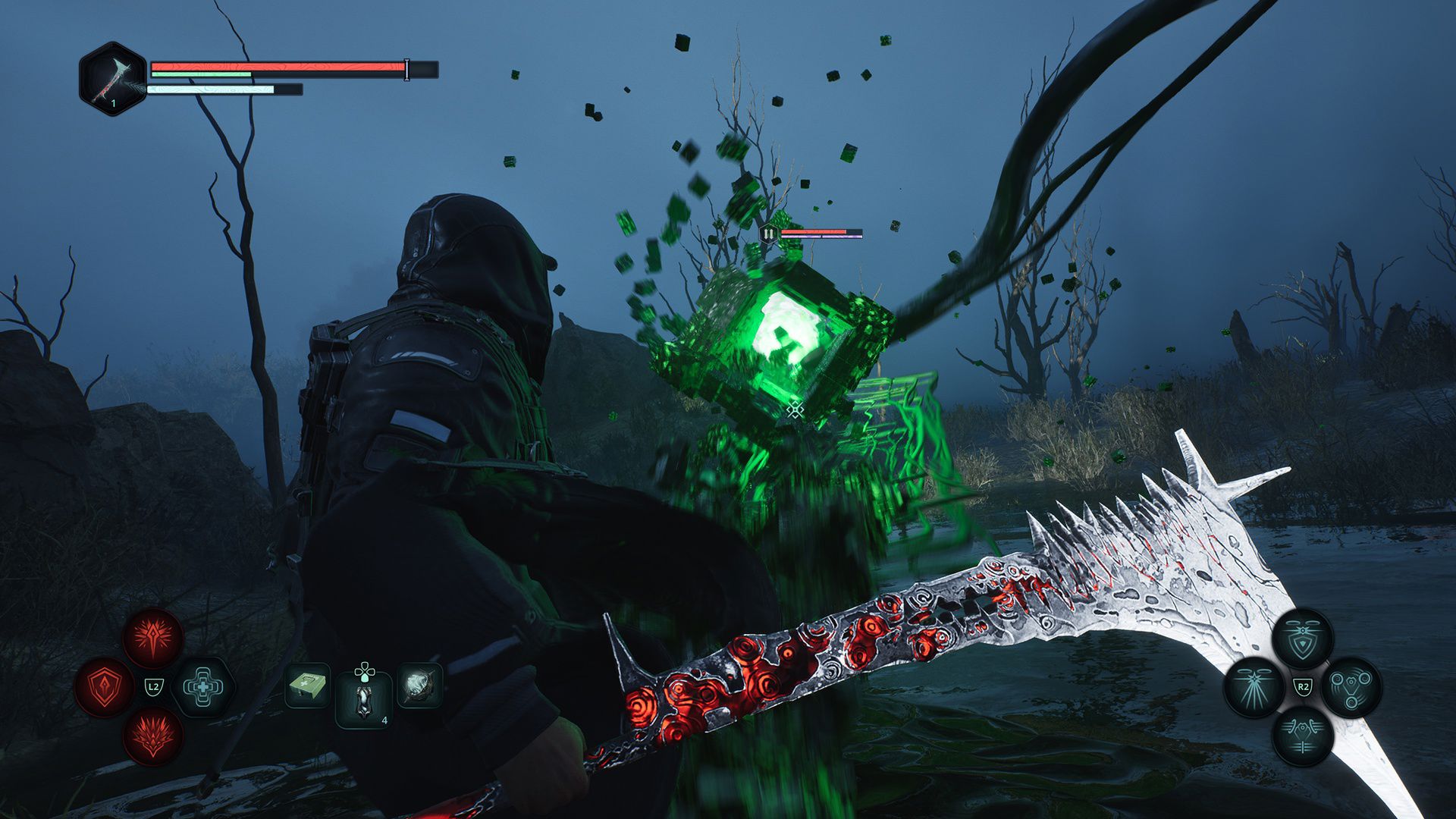 Düşman tasarımı da bu sanat yönetiminin parlayan noktalarından biri. Hollow Walkers, insan duygularının fiziksel tezahürleri olarak kurgulanan yaratıklar, fraktal ve geometrik formlarıyla hem bizarr hem unutulmaz görüntüler yaratıyor. Heykel benzeri görünümleri, oyunun cosmic horror atmosferini güçlendiriyor. Bir düşman sadece bir tehdit değil, aynı zamanda Hadea'nın içinde bulunduğu travmanın görsel bir metaforu haline geliyor.