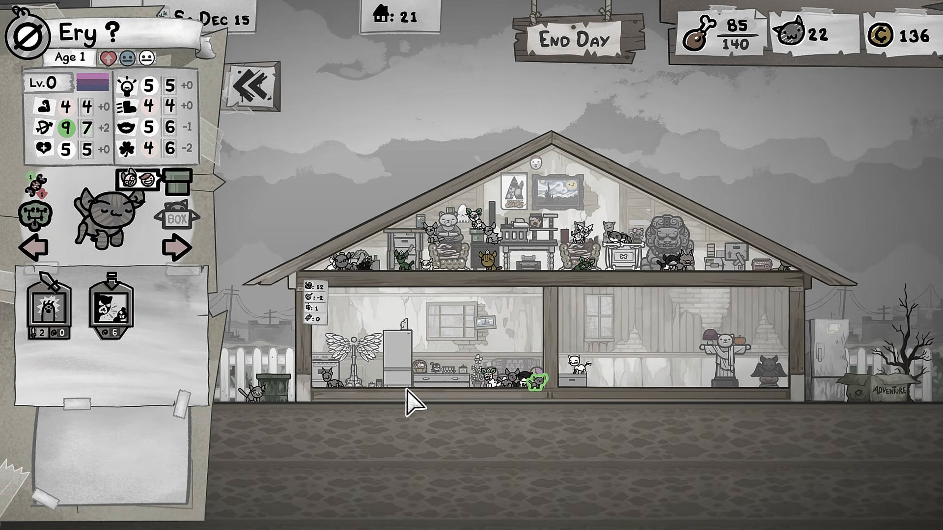 Akşam eve geldiğimizde ise ganimet ve deneyimle dolu ama yorgun ve yaralı kediler bizleri karşılıyor. Emekli olanları hangi odalara yerleştirileceğine, hangi eşleşmelerin en iyi yavruları vereceğine karar veriyoruz. Gün sonu çiftleşme fazı otomatik ama kontrol edilebilir: kedilerin uyumluluk durumunu, genetik ilişkilerini ve oda özelliklerini göz önünde bulundurarak eşleşmeleri planlamak bir satranç oyunu gibi. Sonra uyuyoruz ve ertesi sabah yeni yavrularla, yeni sokak kedileriyle ve yeni zorluklarla uyanıyoruz. Bu döngü hiç bitmiyor ama hiç monotonlaşmıyor da çünkü her gün farklı kararlar, farklı riskler ve farklı ödüller getiriyor.
