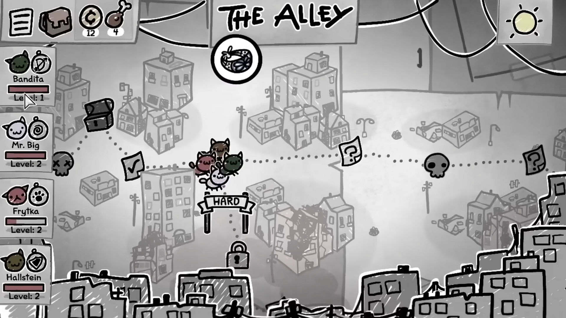 Mewgenics açık dünya değil ama lineer de değil - bunun yerine dallanmış, yapılandırılmış bir ilerleme sistemi sunuyor. Oyun üç ana Act'e bölünmüş ve her Act kendi tematik bütünlüğüne sahip.Birinci Act çürüme ve yeraltı temasıyla açılıyor: The Alley’de sokaklarda ilerliyor, The Sewers’ta kanalizasyonlara iniyor, The Caves’te yeraltı mağaralarına uzanıyor ve The Boneyard’da kemiklerle dolu mezarlıklara ulaşıyoruz. Bu bölümün gizli alanı olan The Throbbing Domain ise oyunun en rahatsız edici ve karanlık görsellerini barındırıyor.