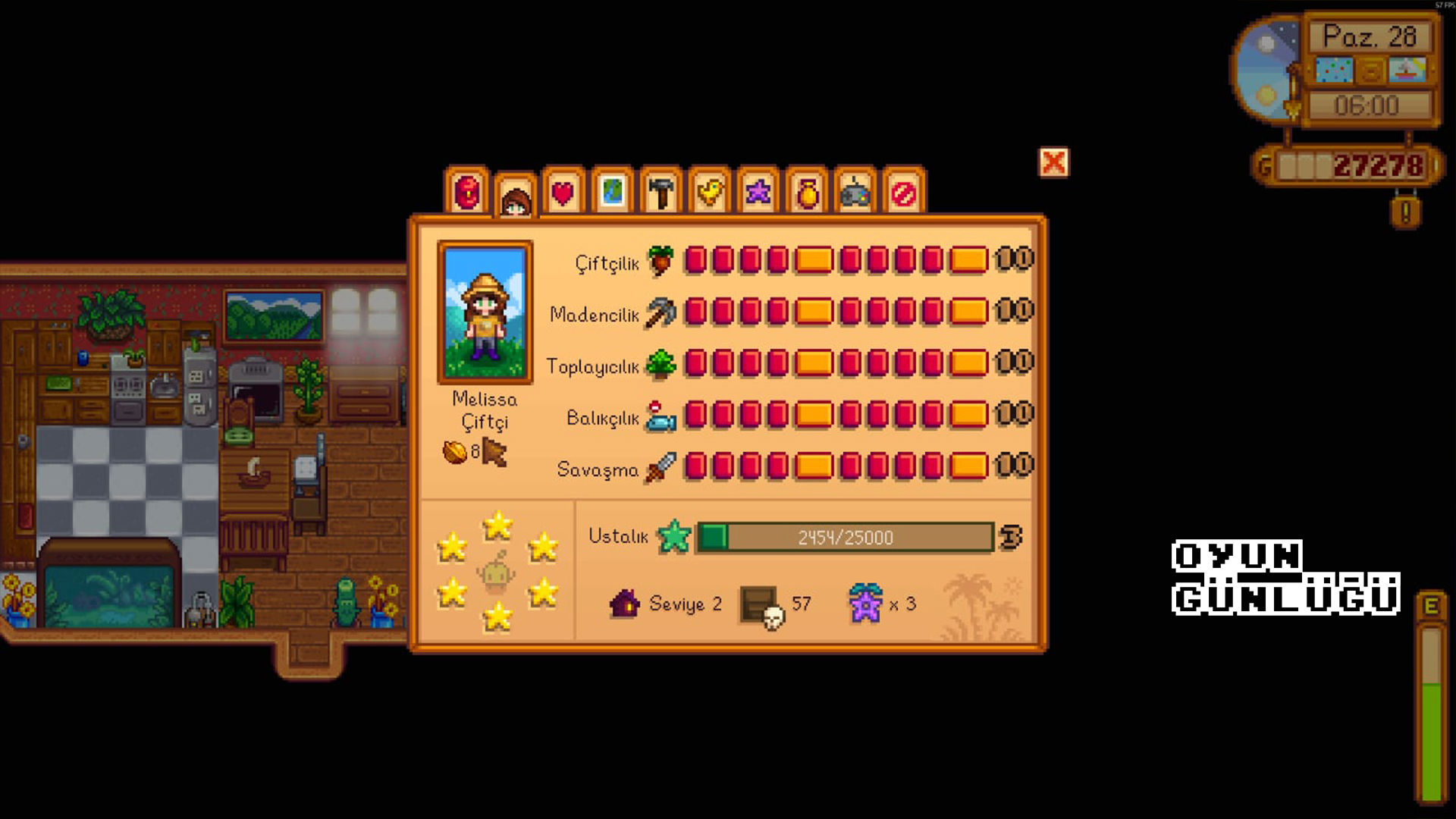 ESC tuşuyla açtığımız ana menüden kısaca bahsetmek istiyorum. Sekmeler soldan sağa doğru envanterinizi ve üzerinizde taşıdığınız aksesuarları, karakterinizin özelliklerini (becerilerdeki ilerleme durumunuzu ve cüzdanınızda bulunan ama envanterinizde yer kaplamayan nesneleri), karakterlerle ilişki durumunuzu, oyunun haritasını, envanterinizdeki nesnelerle oluşturabileceğiniz kullanışlı aletleri, çiftliğinizde bulunan hayvanları ve o hayvanlarla ilişkinizi, kazandığınız büyülü özellikleri, koleksiyonunuzu, oyun ayarlarını ve son olarak da oyunu kapatma sekmesini görebilirsiniz. Bir günü bitirdiğinizde ilerlemeniz kendi kendine kaydedilir.