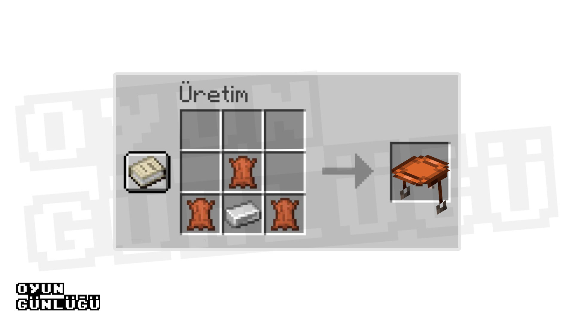 Eyer için üç deri ve bir demir külçesine ihtiyacınız var. Derileri ineklerden karşılayabilir, demir cevheri bularak da işlem sonucu demir külçesi elde edebilirsiniz. Attaki görseldeki gibi ise eyerinizi yapabilirsiniz.